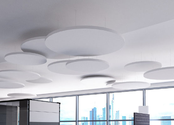 Akustik kumaş paneller,tavan ve duvarlarda bağımsız olarak konumlandırılabildiği yanı sıra tavandan sarkıt olarakta değerlendirilebilirler.Sarkık olarak kullanılan akustik kumaş panellere yüzer tavan panelleri adı verilir.